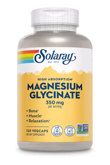 Solaray Magnesium Glycinate 350 mg is formulated for optimum bioavailability and gentle digestion. This award-winning supplement supports healthy muscles, bones, relaxation, and a healthy heart.* This high-quality supplement is produced in a GMP facility certified by NSF, and tested to meet strict guidelines on potency, purity, and contaminants.**